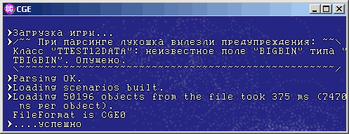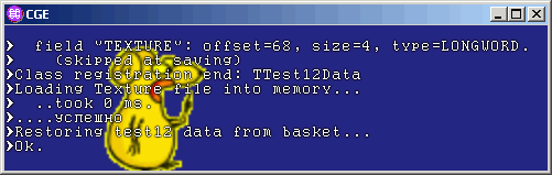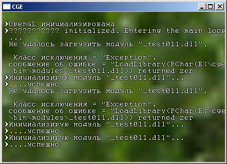 Да, и я не забыл упомянуть, что появилась консоль?.. В отличие от большинства движков, она лишь средство просмотра лога, поскольку для управления программой у нас будут куда более мощные механизмы. Прокручивается мышьим колесом.
