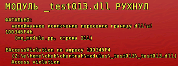 Баг ФриПаскаля №4605 (исключения в dll для Windows не ловятся) практически сводил на нет применимость самой архитектуры Chentrah, поскольку любое исключение в игровом модуле под Windows пробивало до модуля-матки, и программе оставалось только убиться об стенку: такие пряники, как, например, автосохранение при крахе рендера были просто невозможны.
