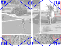 Пиксель, отмечающий угол, останется за краем выровненной картинки. Разметка углов распознаётся в "уголках" (см. схему) размером в 20% от самой короткой стороны картинки. (отсюда, необязательно стараться, подбирая границы при сканировании - можно взять с запасом, а обрезать уже в процессе обработки - см. приложенный образец цветной манги).